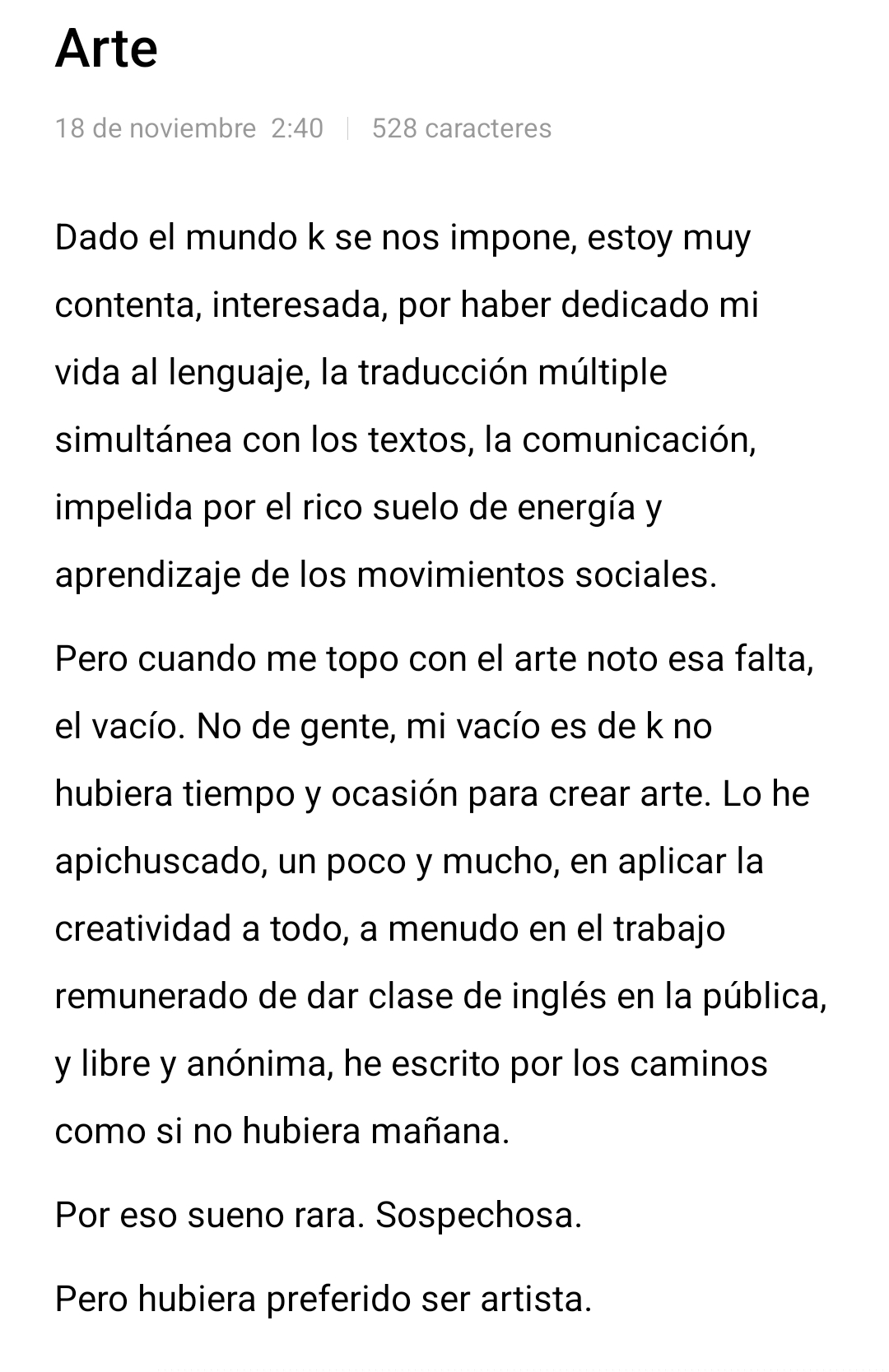 Dado el mundo k se nos impone, estoy muy contenta, interesada, por haber dedicado mi vida al lenguaje, la traducción múltiple simultánea con los textos, la comunicación, impelida por el rico suelo de energía y aprendizaje de los movimientos sociales. Pero cuando me topo con el arte noto esa falta, el vacío. No de gente, mi vacío es de k no hubiera tiempo y ocasión para crear arte. Lo he apichuscado, un poco y mucho, en aplicar la creatividad a todo, a menudo en el trabajo remunerado de dar clase de inglés en la pública, y libre y anónima, he escrito por los caminos como si no hubiera mañana. Por eso sueno rara. Sospechosa. Pero hubiera preferido ser artista.