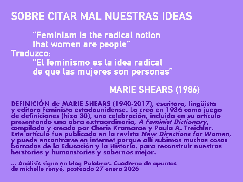 A 2026 se insiste en NO VERIFICAR las citas QUE SE ATRIBUYEN SIN CITAR FUENTE: ayer la he visto atribuida a Angela Davis, por gente comprometida socialmente (que, obvio, no la han leído, una pensadora fundamental, que les enseñaría la importancia de que el análisis identifique autocríticamente errores para poder mejorar la capacidad de pensar y conocer). ATRIBUIR MAL no es sólo un error que borra a quien aporta algo, también borra la voz de la persona a la que se atribuye mal la cita. Muchas suscribimos la definición de Marie Shears, pero eso no implica que no podamos saber que alguien lo dijo, cuándo, dónde, por qué. No siempre se sabe, y a menudo lo mismo lo dicen varias personas en diferentes lugares o épocas, pero en este caso se puede saber de una que lo dijo y generó que esa idea la transmitiera mucha gente, y lo sabemos porque estamos compartiendo informaciones, documentos en internet que nos ayudan a corregir muchos errores y concepciones dominantes.